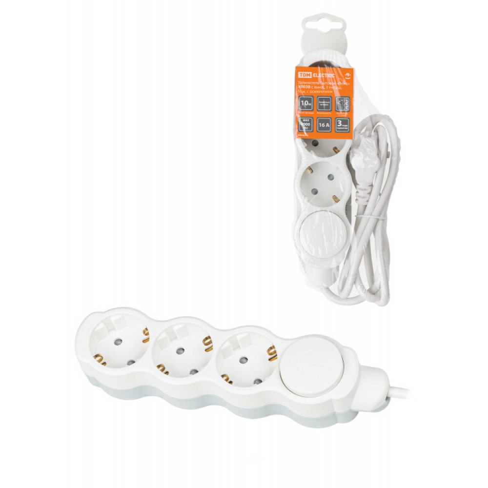 Удлинитель бытовой "Люкс" УЛ03В выкл, 3 гнезда, 10м, с/з, с з/ш, ПВС 3х1мм2 16А/250В бело-серый SQ1303-0181, Удлинитель, сетевой фильтр