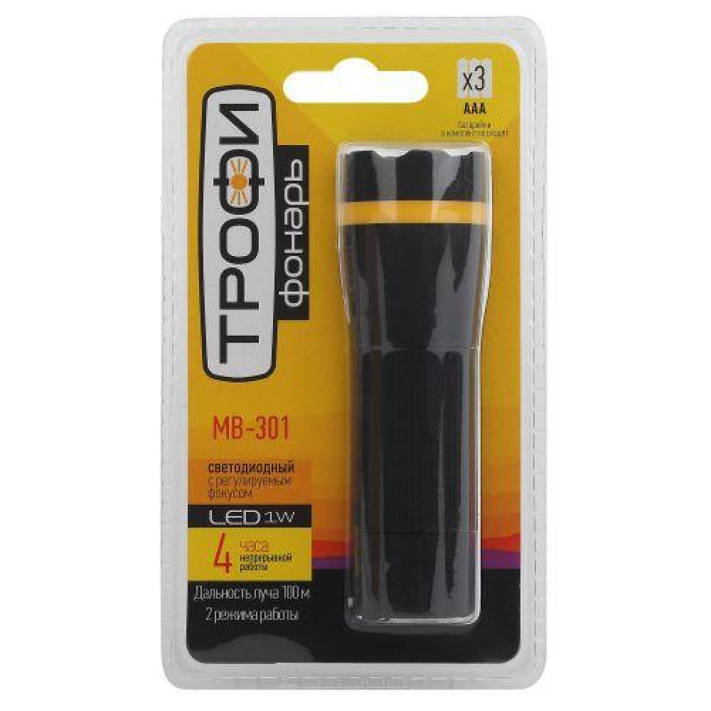 Трофи MB-301 легкий ручной LED-фонарь для работы, кемпинга и универсального бытового применения. Отличается ярким дальним лучом 100 метров. Имеется фокусировка освещения. Корпус изготовлен из ударопрочного пластика. Фонарь работает от 3 мизинчиковых батареек. Одного комплекта элементов питания хватает на 4 полных часа непрерывного свечения. Простой в управлении, удобный и практически невесомый, Трофи МВ-301 станет надежным помощником, в дороге, на природе, на даче, в гараже.