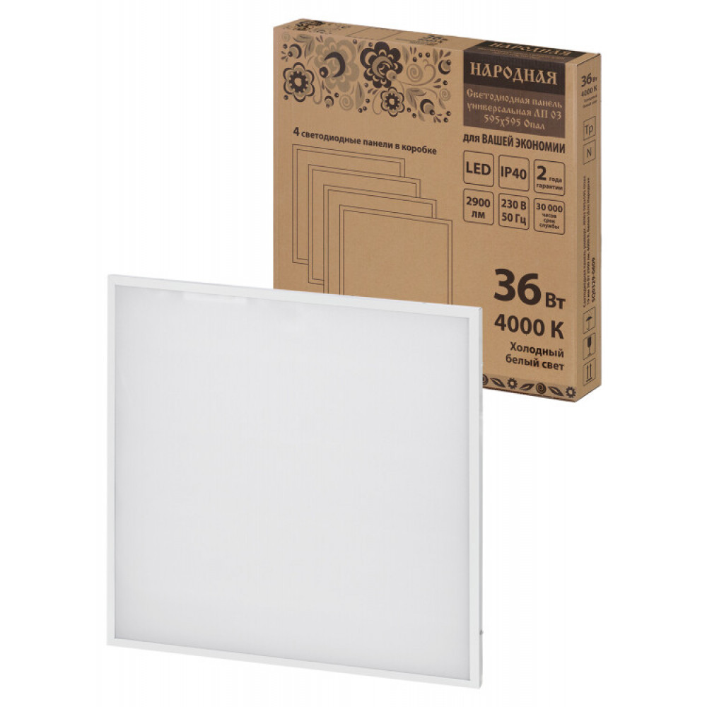 Описание Светодиодная панель универс. ЛП03 595х595 Опал 19 мм 36 Вт 2900 лм, 4000 К, белая (б/п) Народная SQ0329-0609