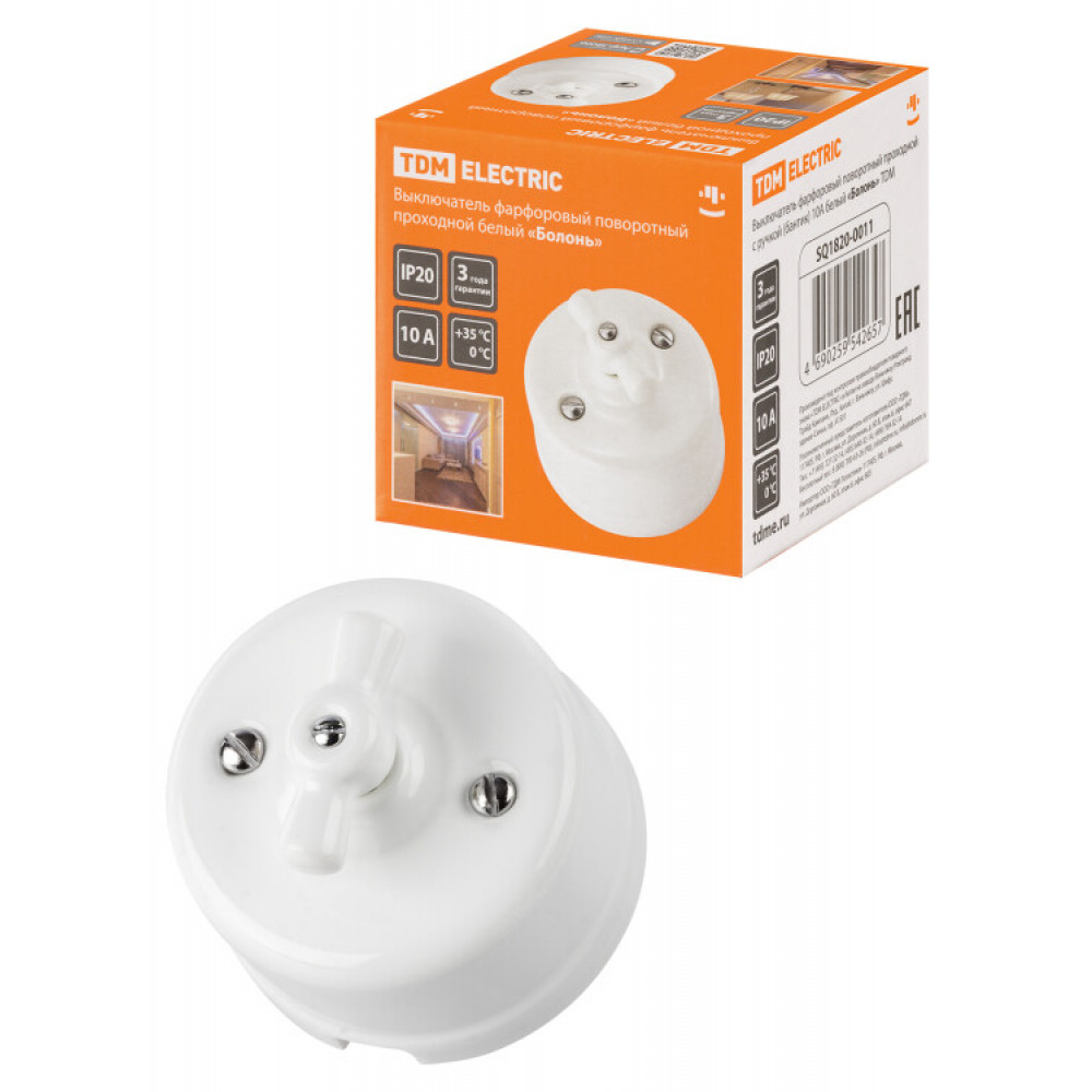 Выключатель фарфоровый поворотный проходной с ручкой (бантик) 10А белый «Болонь» SQ1820-0011, Изделие электроустановочное