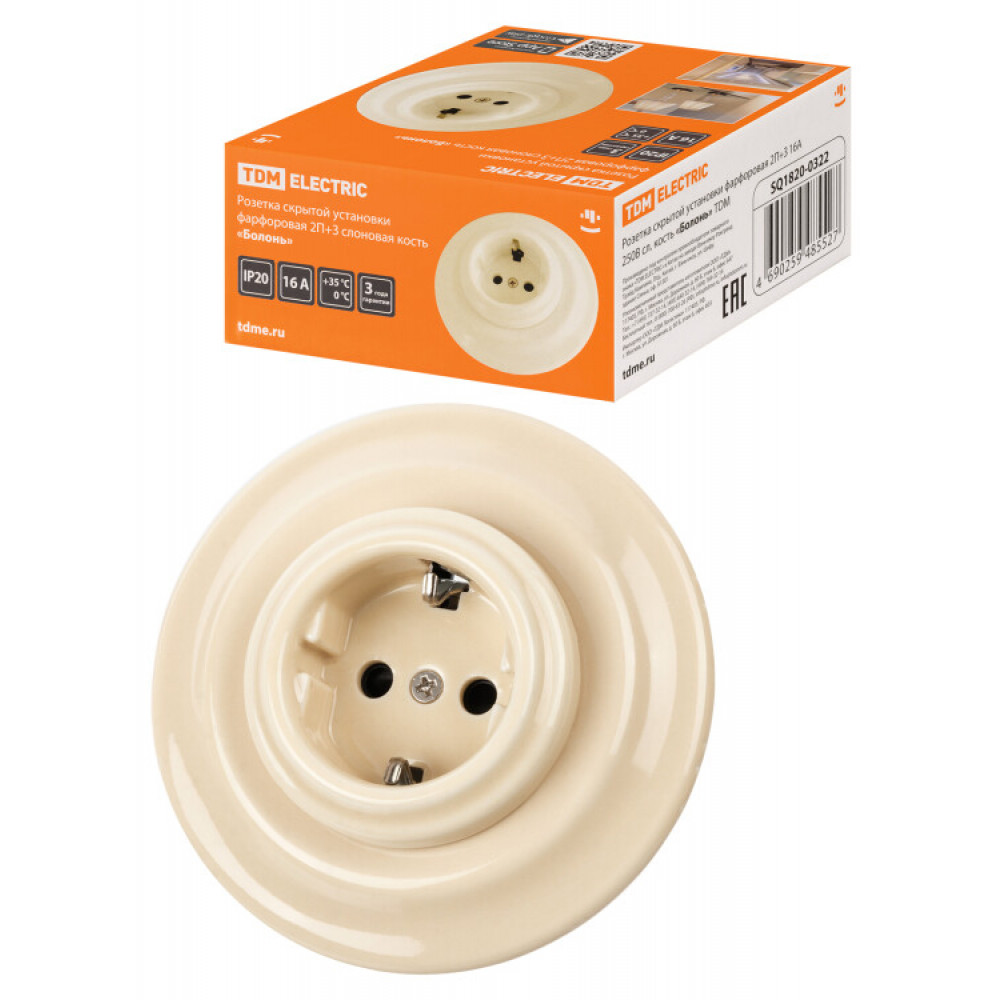 Розетка скрытой установки фарфоровая 2П+З 16А 250В сл. кость «Болонь» SQ1820-0322, Розетка скрытого монтажа