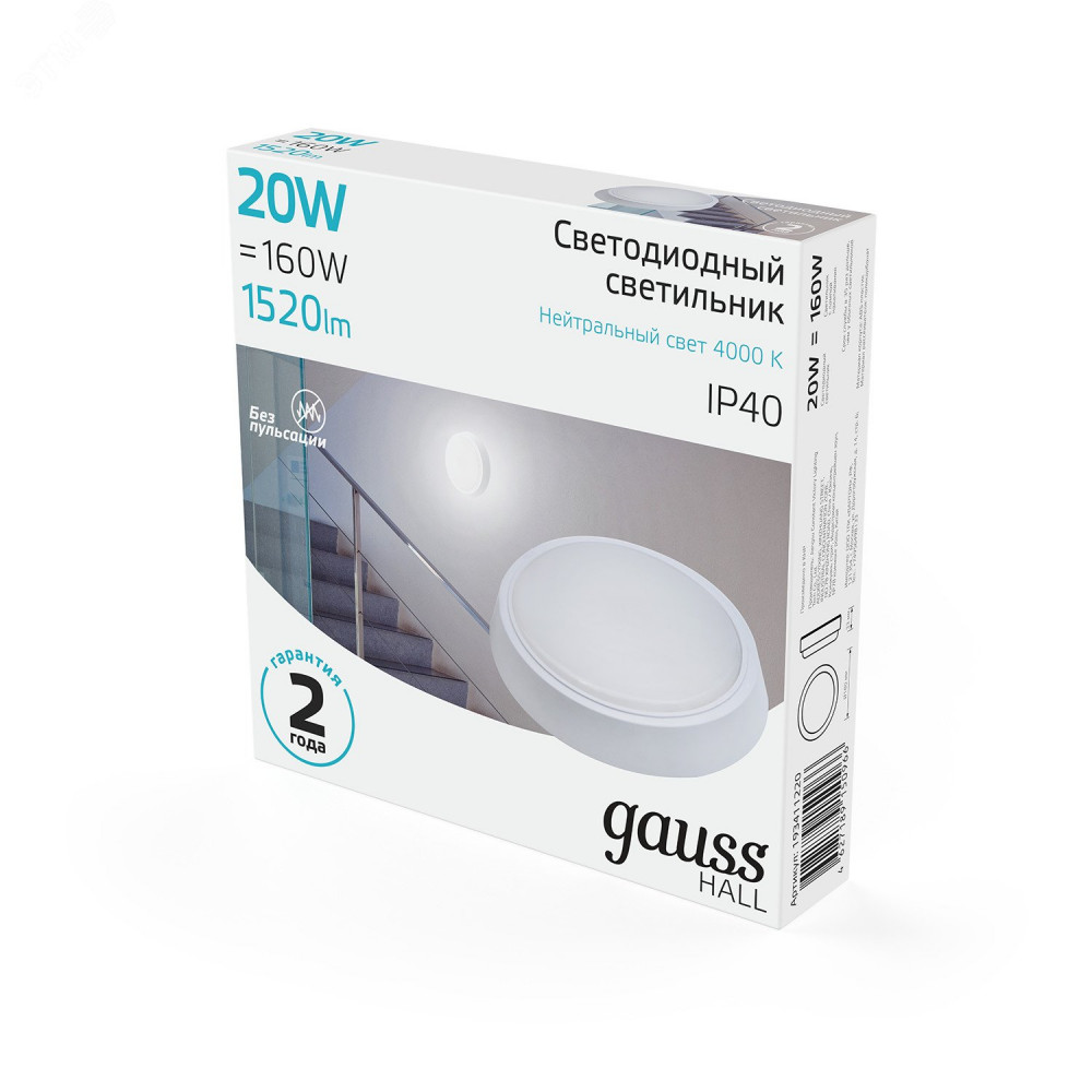 Описание Светильник ЖКХ HALL круг 20W 1520lm 4000K 200-240V IP40 D180*33мм белый LED 1/40 193411220