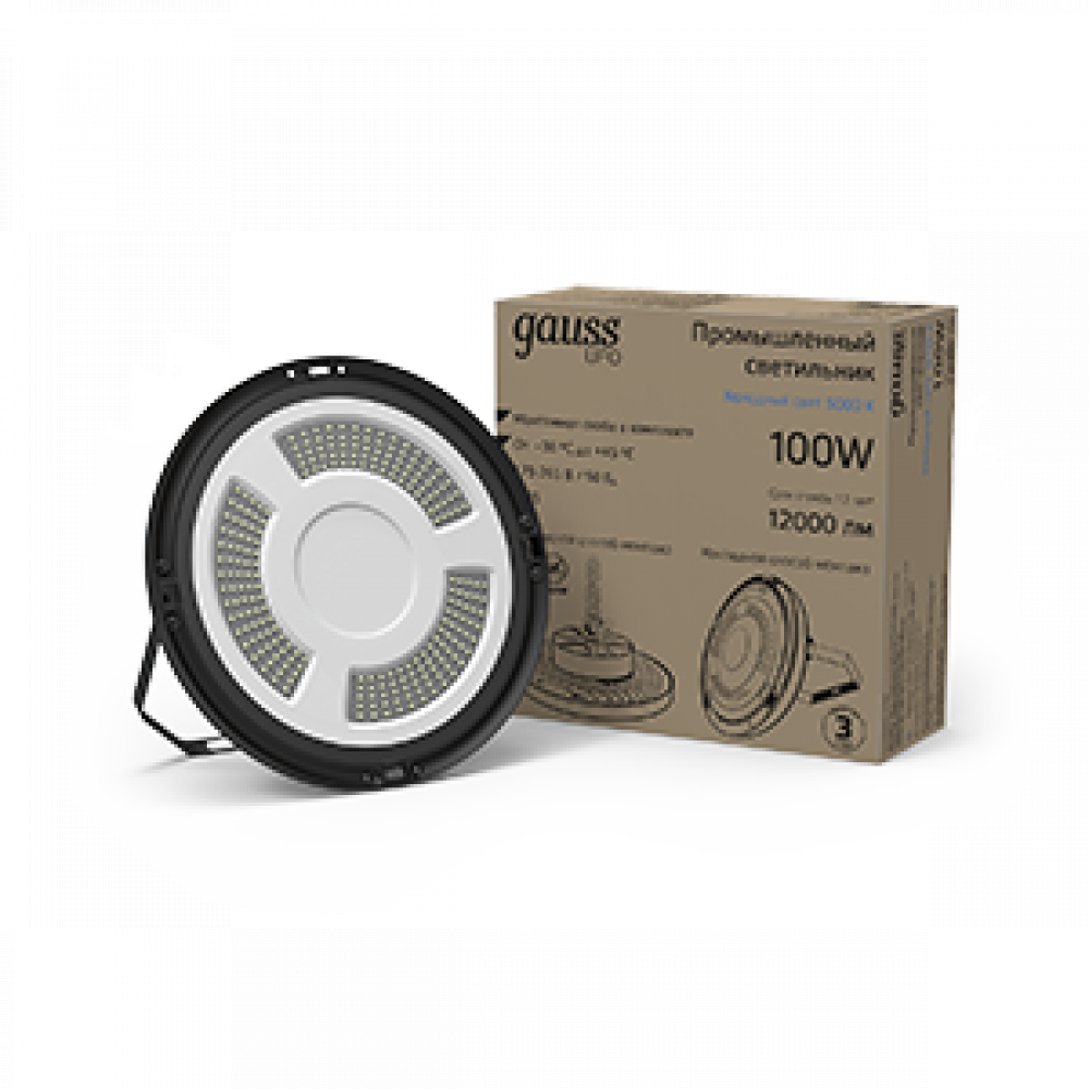 Описание Светильник подвесной UFO 100W 12000lm 5000K 175-265V IP65 D230*88мм черный скобка в комплекте 821536300