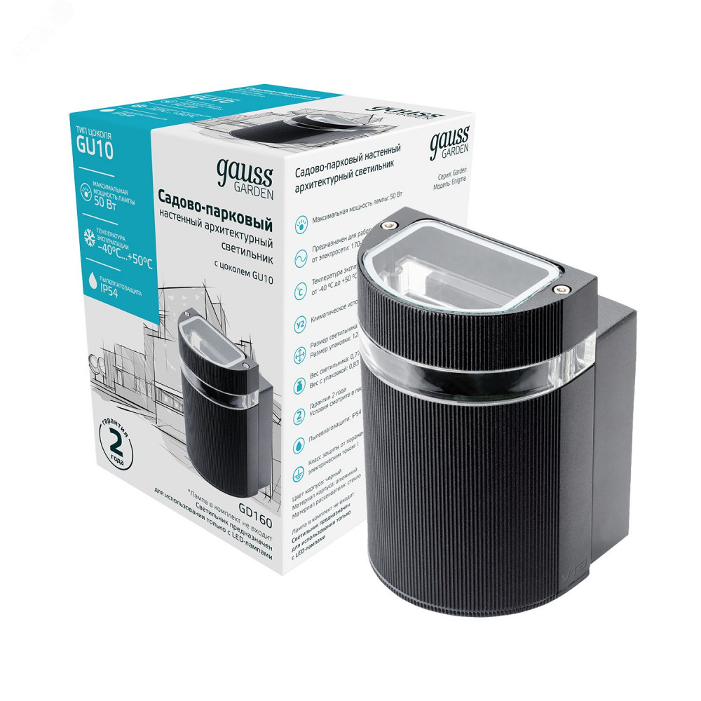 Описание Светильник садово-парковый Enigma настенный архитектурный, GU10, 100*105*155mm, 170-240V / 50Hz, 1xMax.50W, IP54, 1/18 GD160