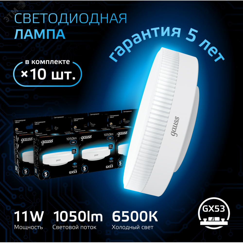 Описание Лампа GX53 11W 1050lm 6500K LED 1/10/100 108008311
