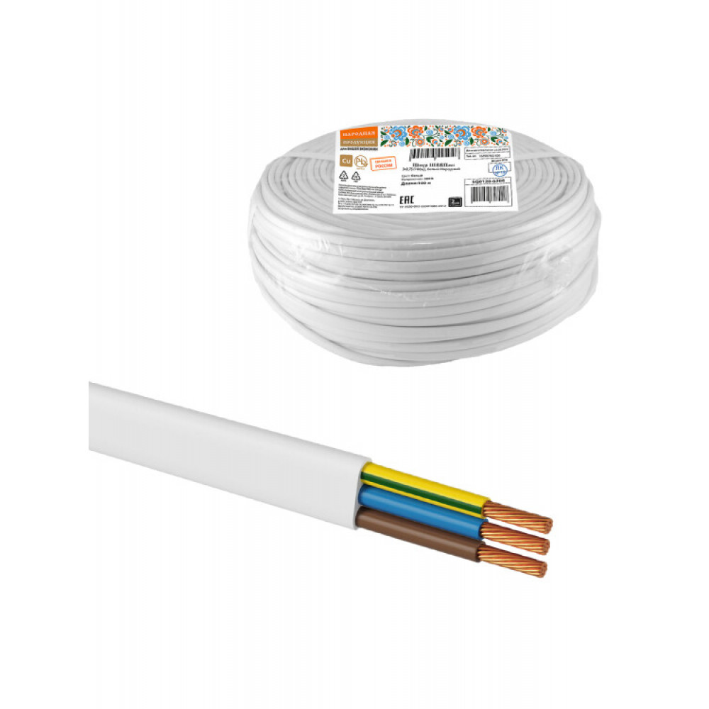 Описание Шнур ШВВПмб 3х0,75 (100м), белый Народный SQ0120-0306