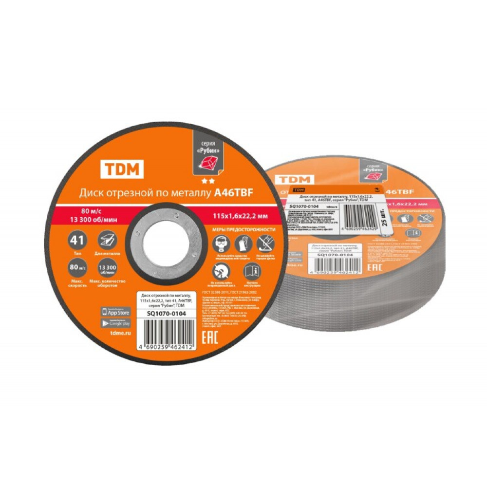 Описание Диск отрезной по металлу, 115х1,6х22,2, тип 41, A46TBF, серия "Рубин", SQ1070-0104