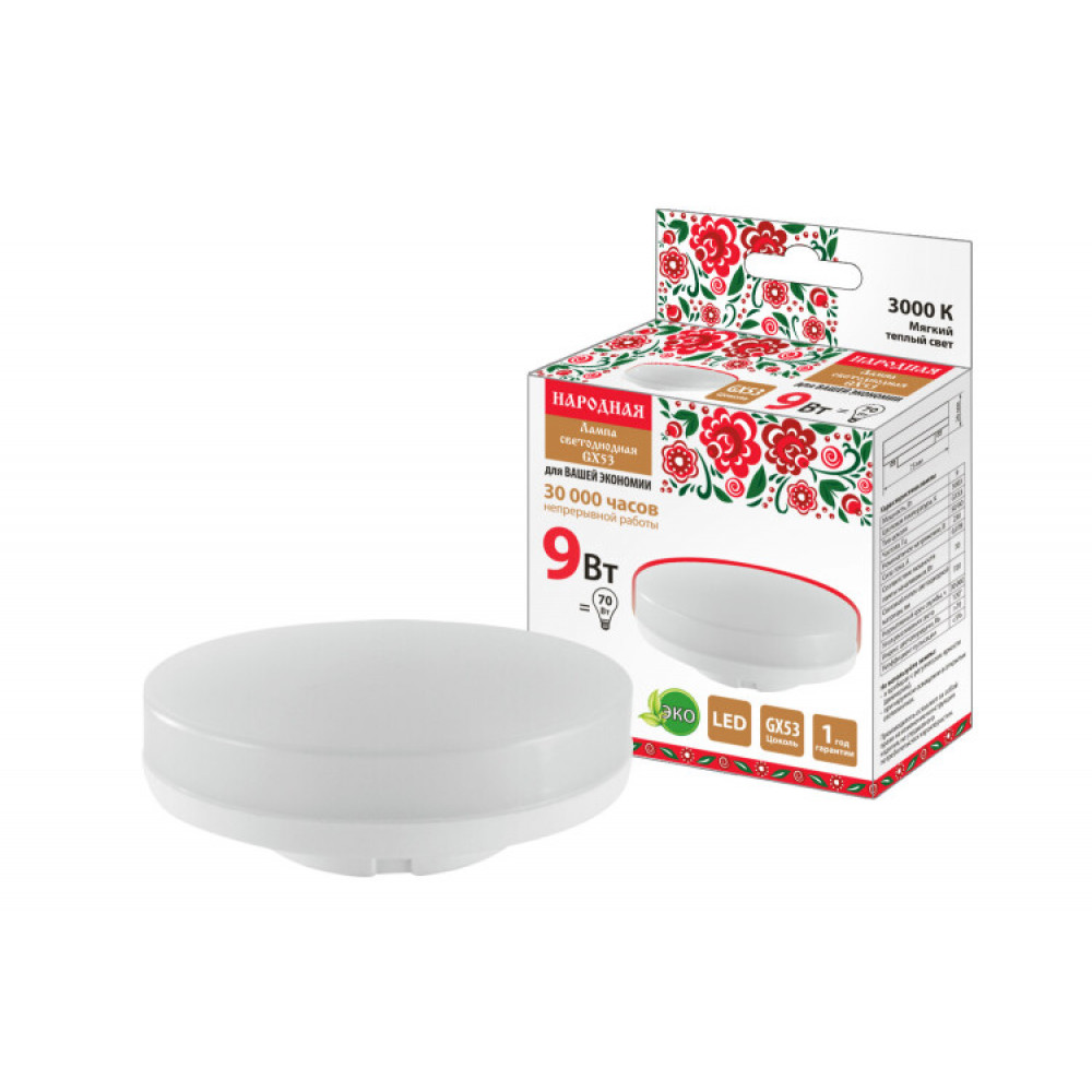 Описание Лампа светодиодная GX53-9 Вт-230 В-3000 К-Э, h=26 мм, Народная SQ0340-1521