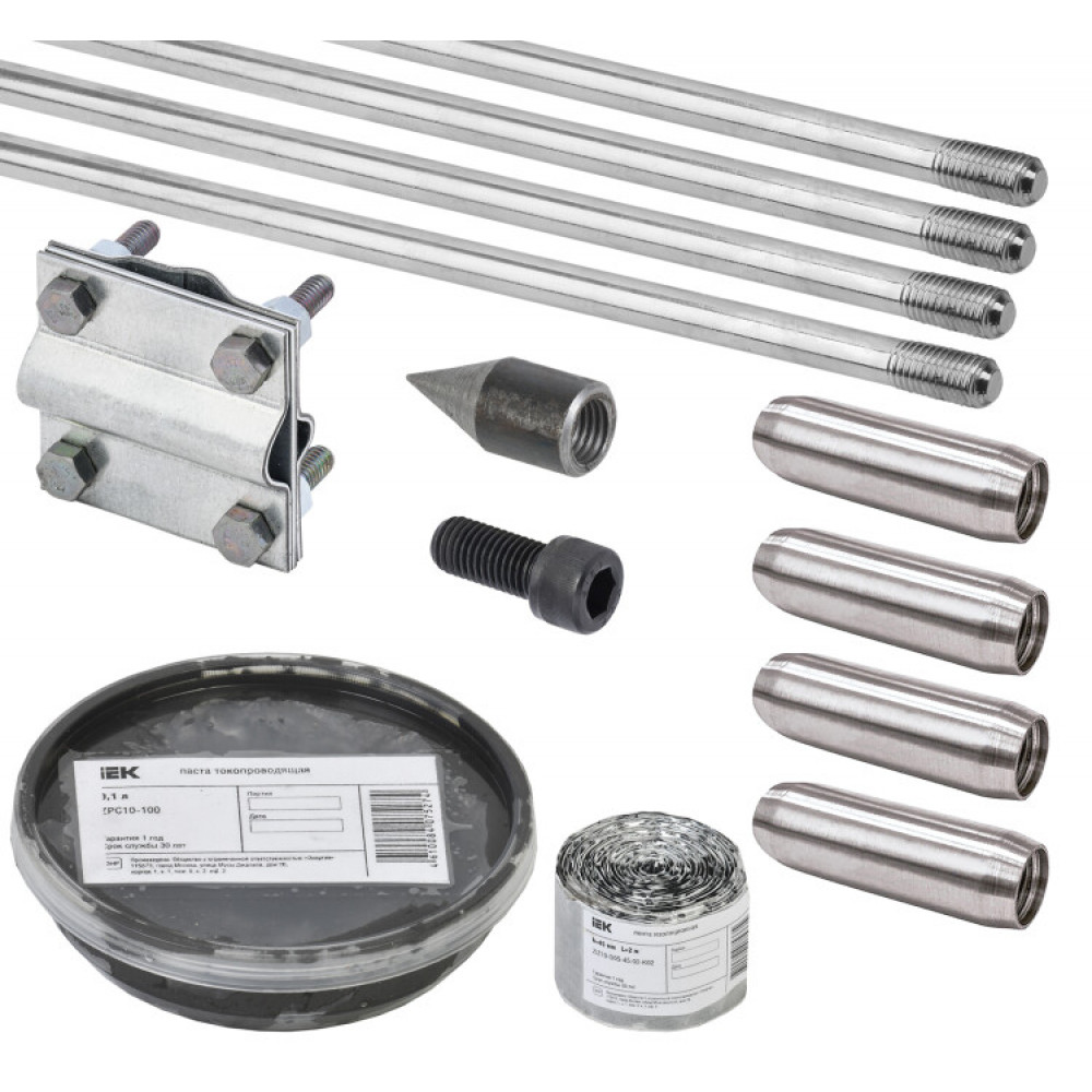 Комплект заземления товарного знака IEK используется для организации заземляющего устройства жилых объектов, объектов энергетического и промышленного комплексов, объектов связи. Данный комплект монтируется на глубину 6 метров путём последовательного соединения и заглубления стержней с помощью перфоратора или кувалды.