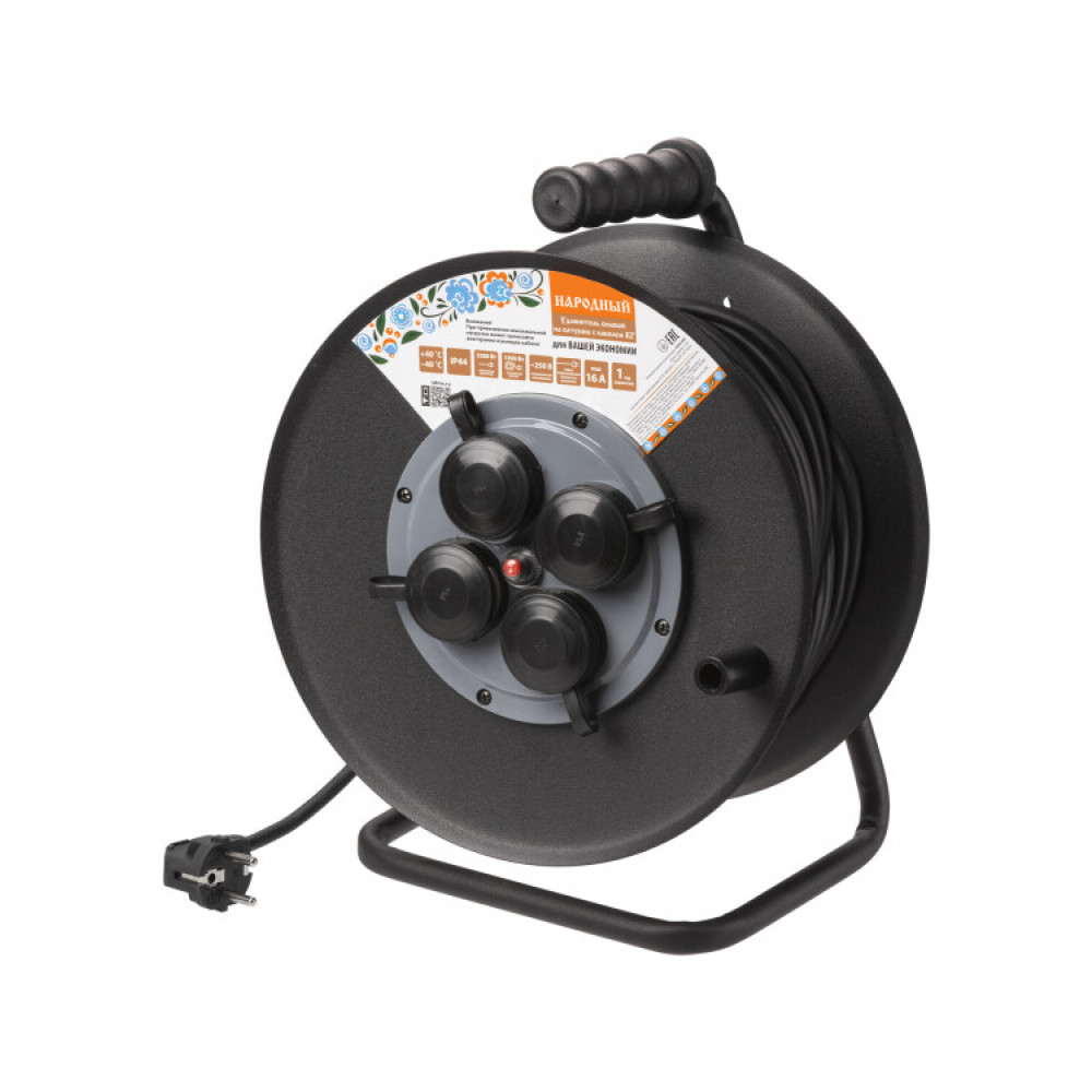 Описание Удлинитель силовой УХз16-004 (метал. катушка, А3, 4 места IP44/50 м КГ 3500 Вт) Народный SQ1307-0162