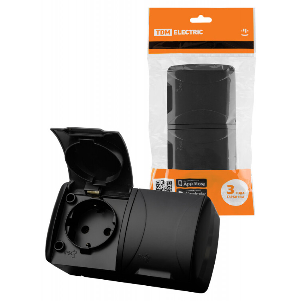 Описание Розетка двойная 2П+3 открытой установки IP54 16А с крышкой графит "Селигер" SQ1818-0314