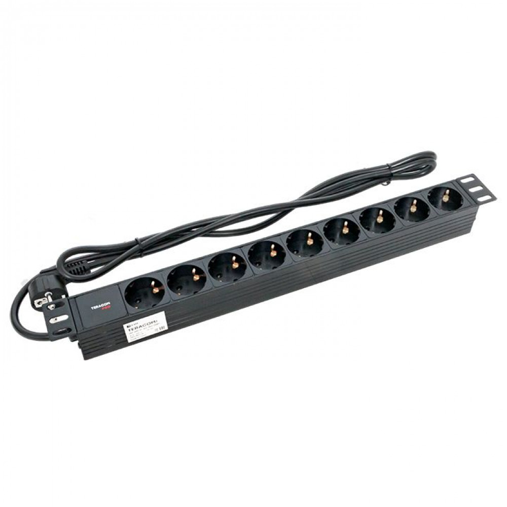 Описание Блок розеток PDU TERACOM PRO 19" 1U 16А/250В 9 розеток Schuko шнур питания длиной 2 метра сечение 3x1,5 мм2 вилка Schuko корпус пластик черный TRP-HPD-PL-16A-9SH-2MSH