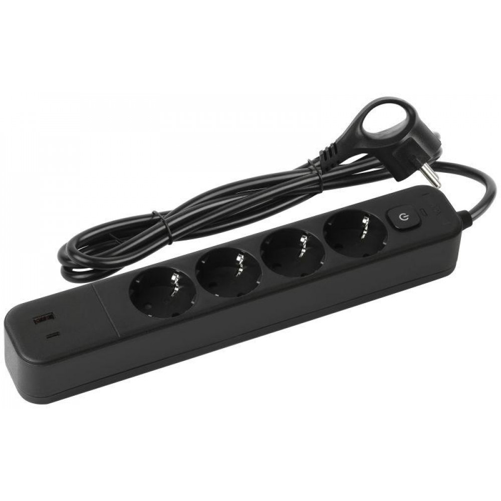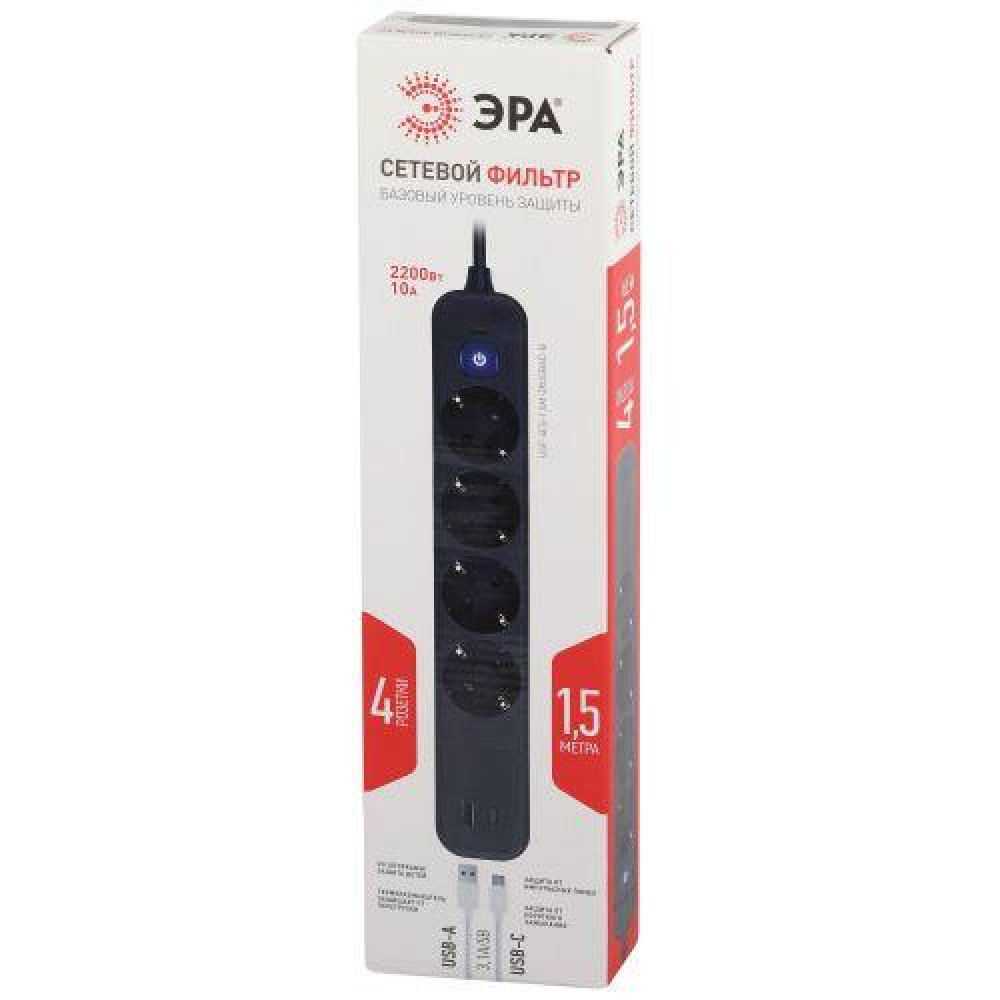 Описание Удлинитель с сетевым фильтром 4х1.5м с заземл. 10А USF-4es-1.5m-2xUSBAC-B +2xUSBA+C 3.1A с выкл. с базов. защитой Б0059572