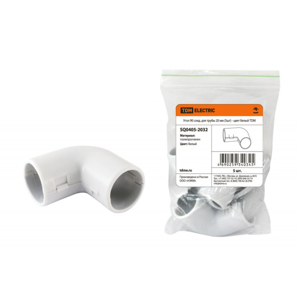 Угол 90 соед. для трубы 20 мм (5шт) - цвет белый SQ0405-2032, Труба и короб для прокладки кабеля