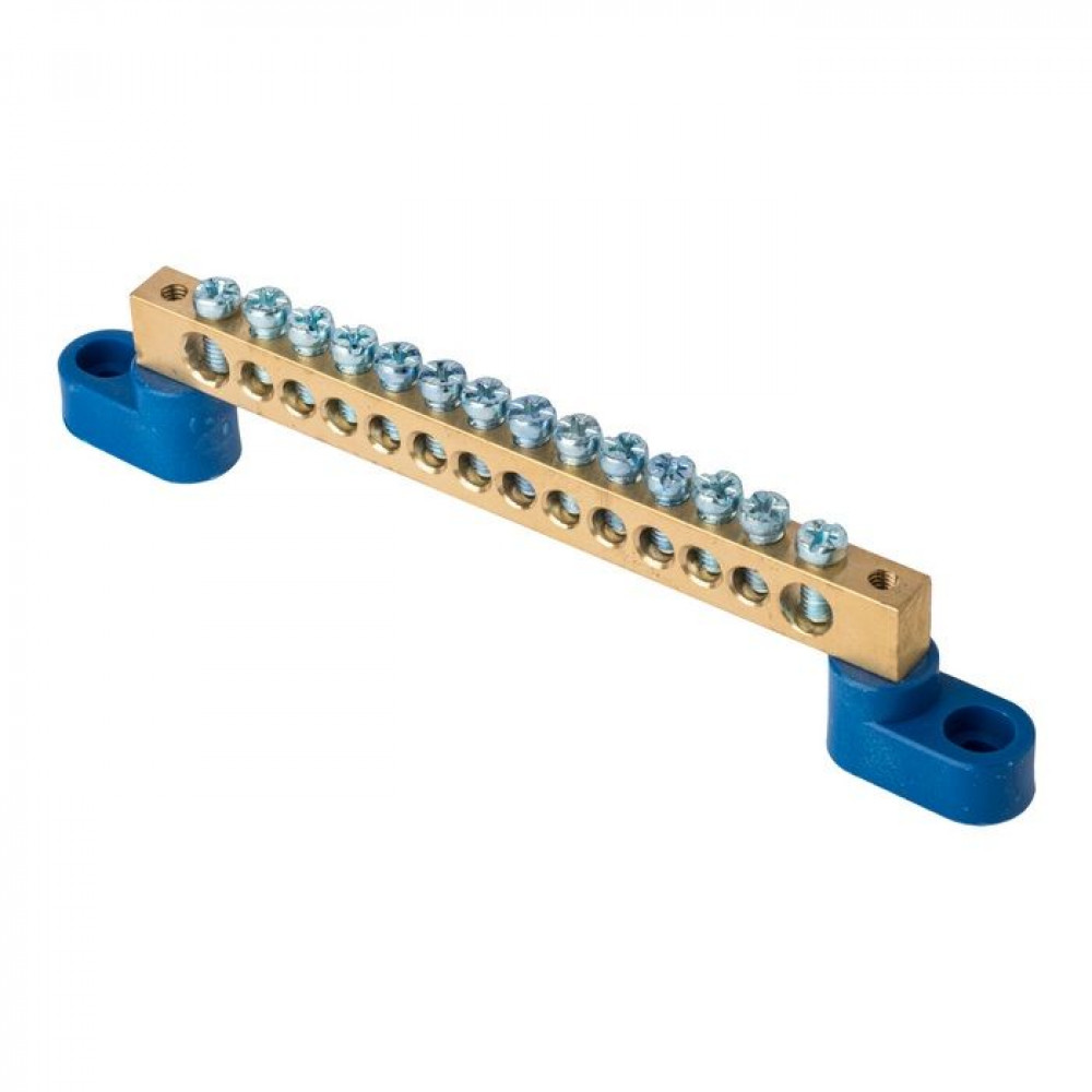 Шина "0" N (8х12мм) 14 отверстий латунь 2 синих угловых изолятора PROxima sn0-125-14-2, Блок клеммный и нулевая шина