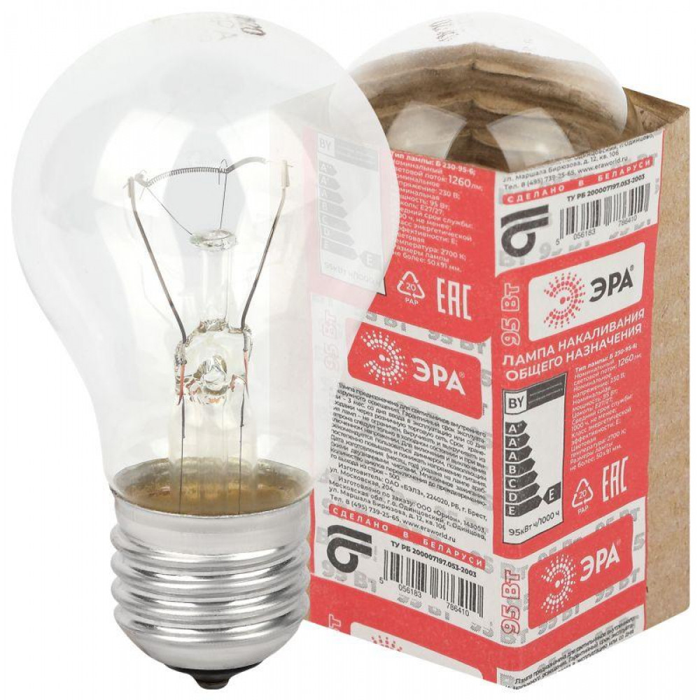 A50 (груша) 95Вт 230В Е27 в гофре (100/3600) Б0039120, Лампа накаливания