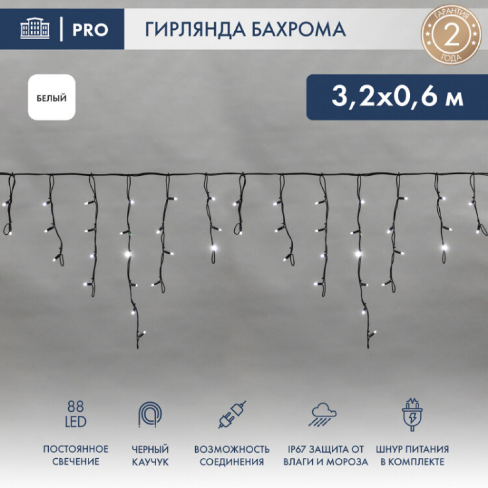 Описание Гирлянда Айсикл (бахрома) светодиодный, 3,2 х 0,6 м, черный провод КАУЧУК, 230 В, диоды белые, 88 LED 255-275