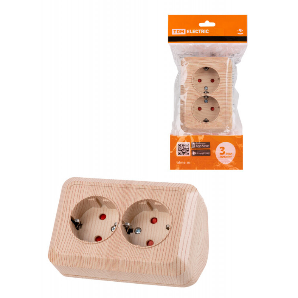 Розетка угловая двойная 2П+3 открытой установки с з/ш IP20 250В 16А сосна "Ладога" SQ1801-0443, Розетка открытого монтажа