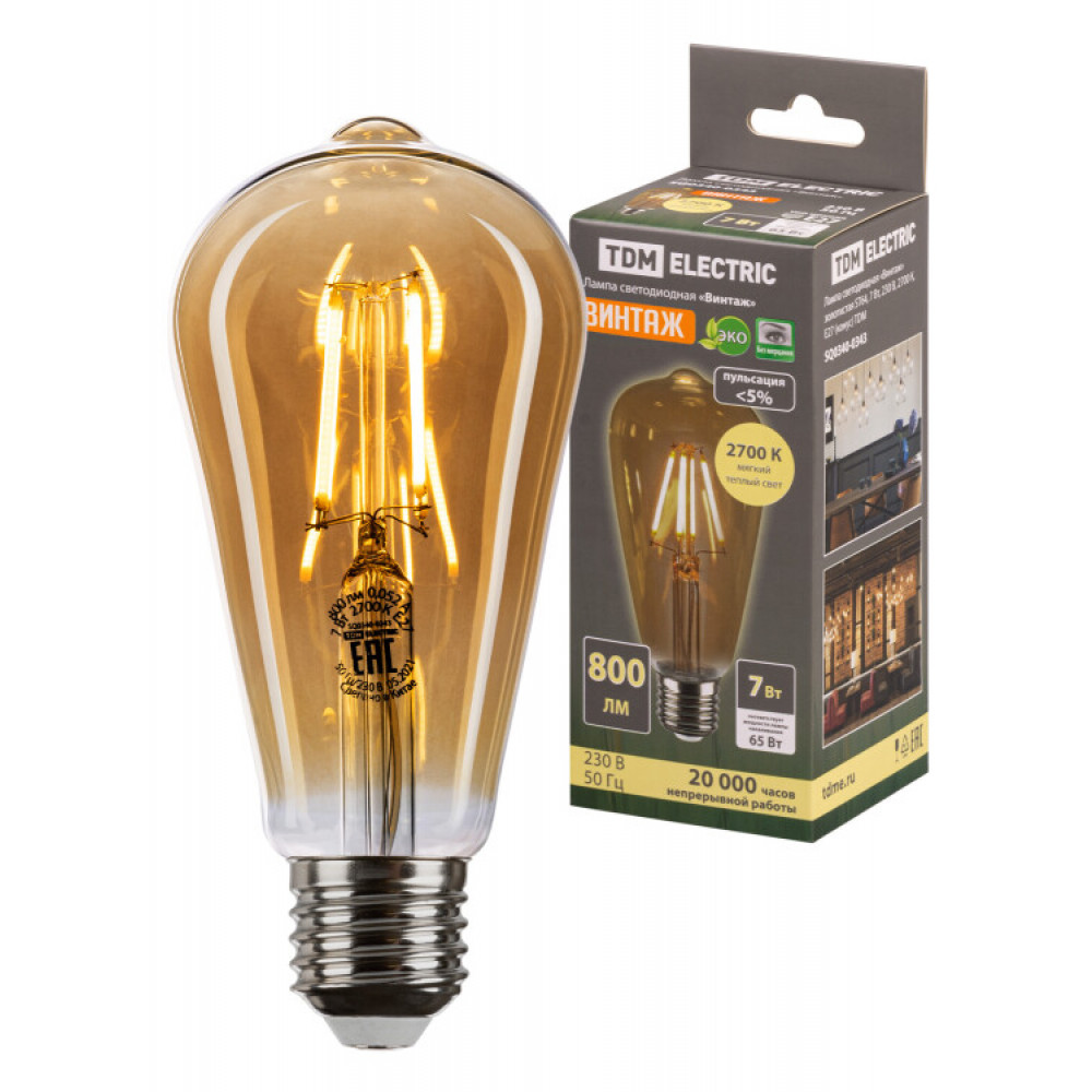 Описание Лампа светодиодная «Винтаж» золотистая ST64, 7 Вт, 230 В, 2700 К, E27 (конус) SQ0340-0343
