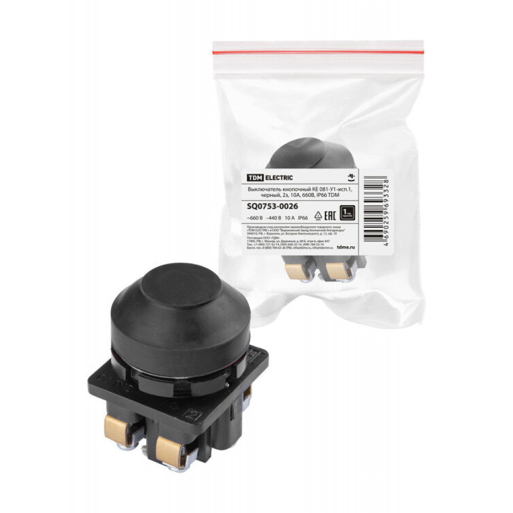Описание Выключатель кнопочный КЕ 081-У1-исп.1, черный, 2з, 10A, 660B, IP66 SQ0753-0026