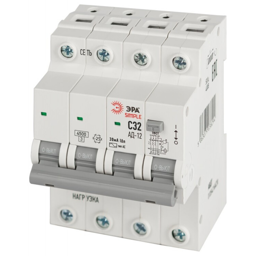 Доставка АВДТ 4,5кА SIMPLE D12E4C32AC30 АД-12 электронное 3P+N С32 30мА тип АС Б0058929