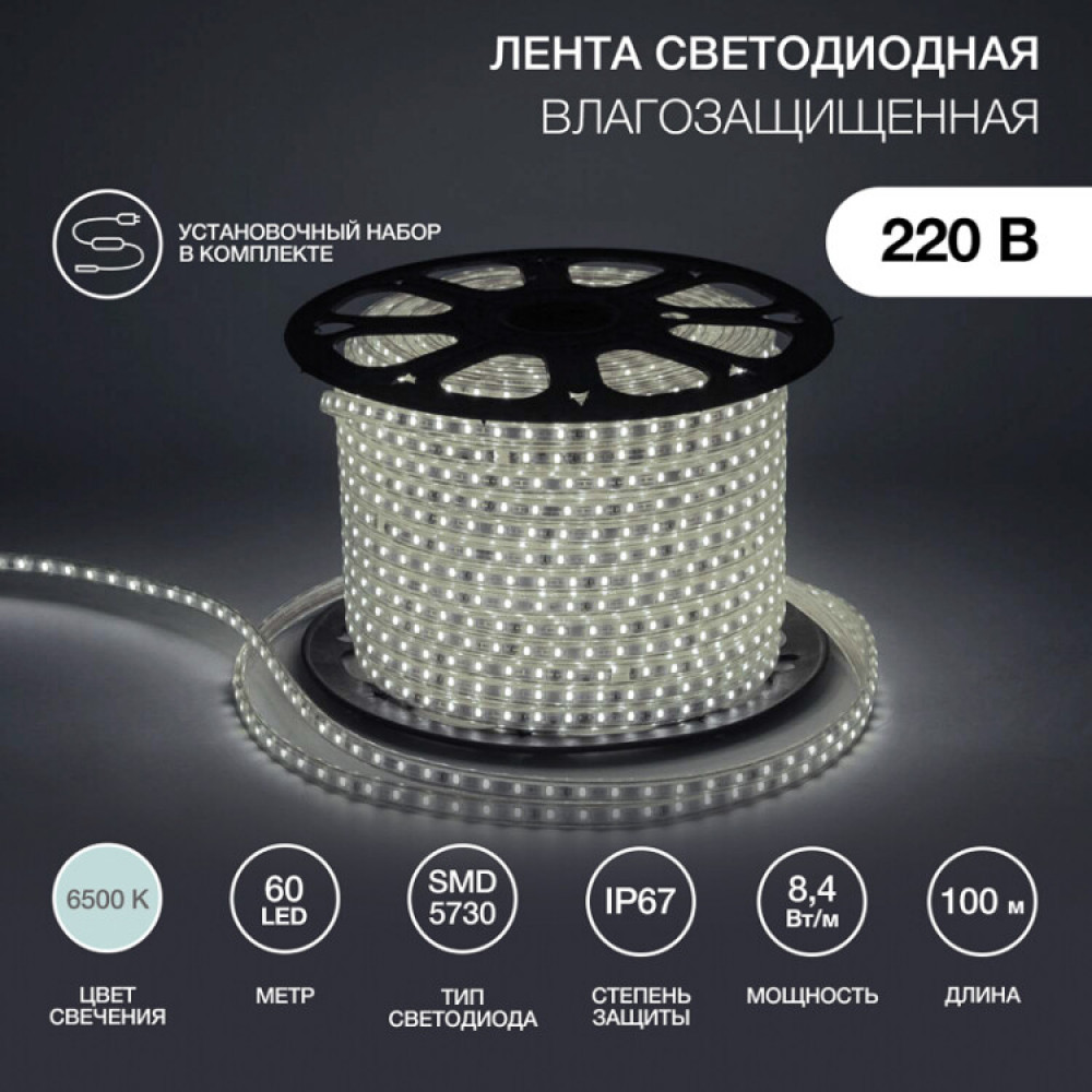 Описание 142-701 LED лента 220 В, 6.5x13 мм, IP67, SMD 5730, 60 LED/m, цвет свечения белый, 100 м(кр.100м