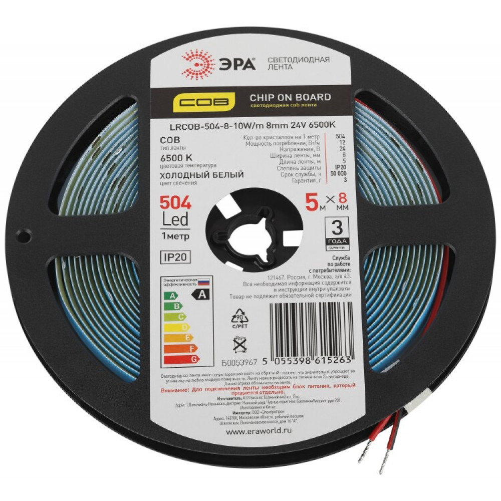 Описание Лента светодиодная LRCOB-504-8 10W/m 8mm 24V 6500K 3year белая 5 м Б0053967