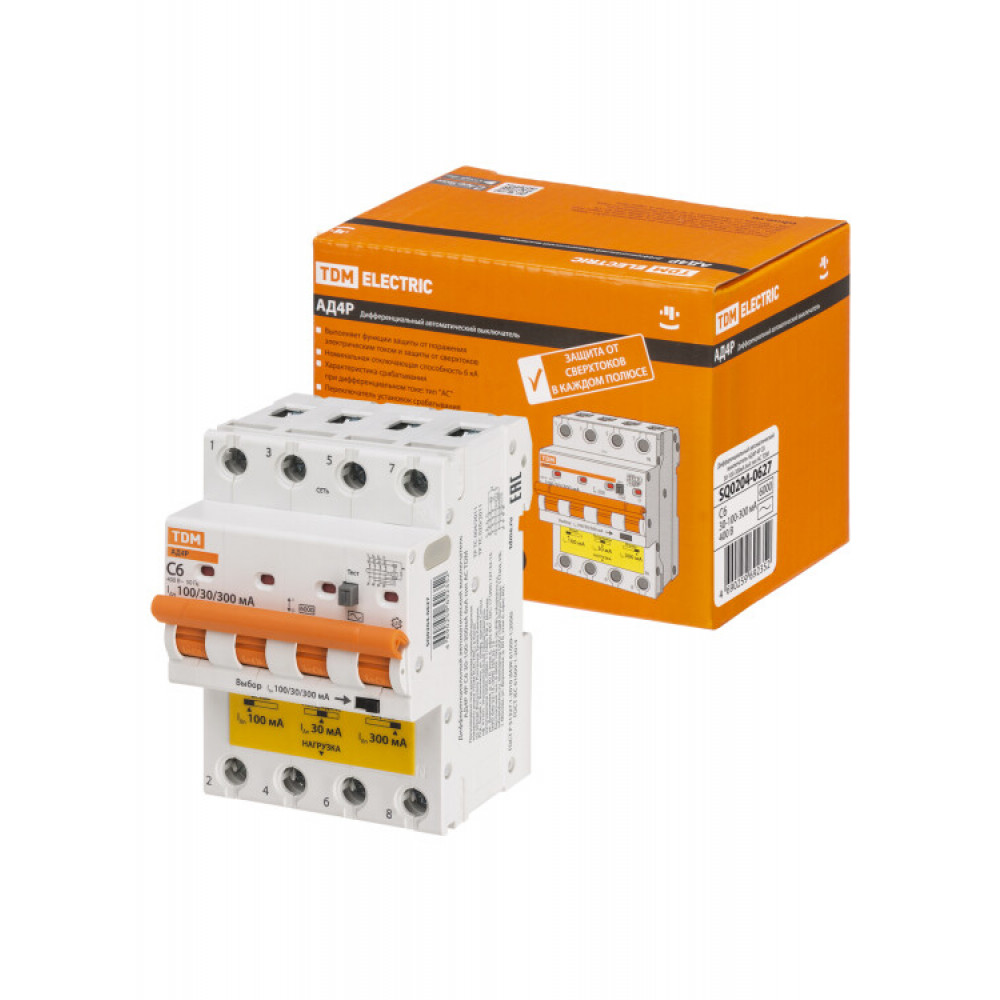 Описание Диф.автомат АД4P 4Р С6 30-100-300мА 6кА тип АС SQ0204-0627