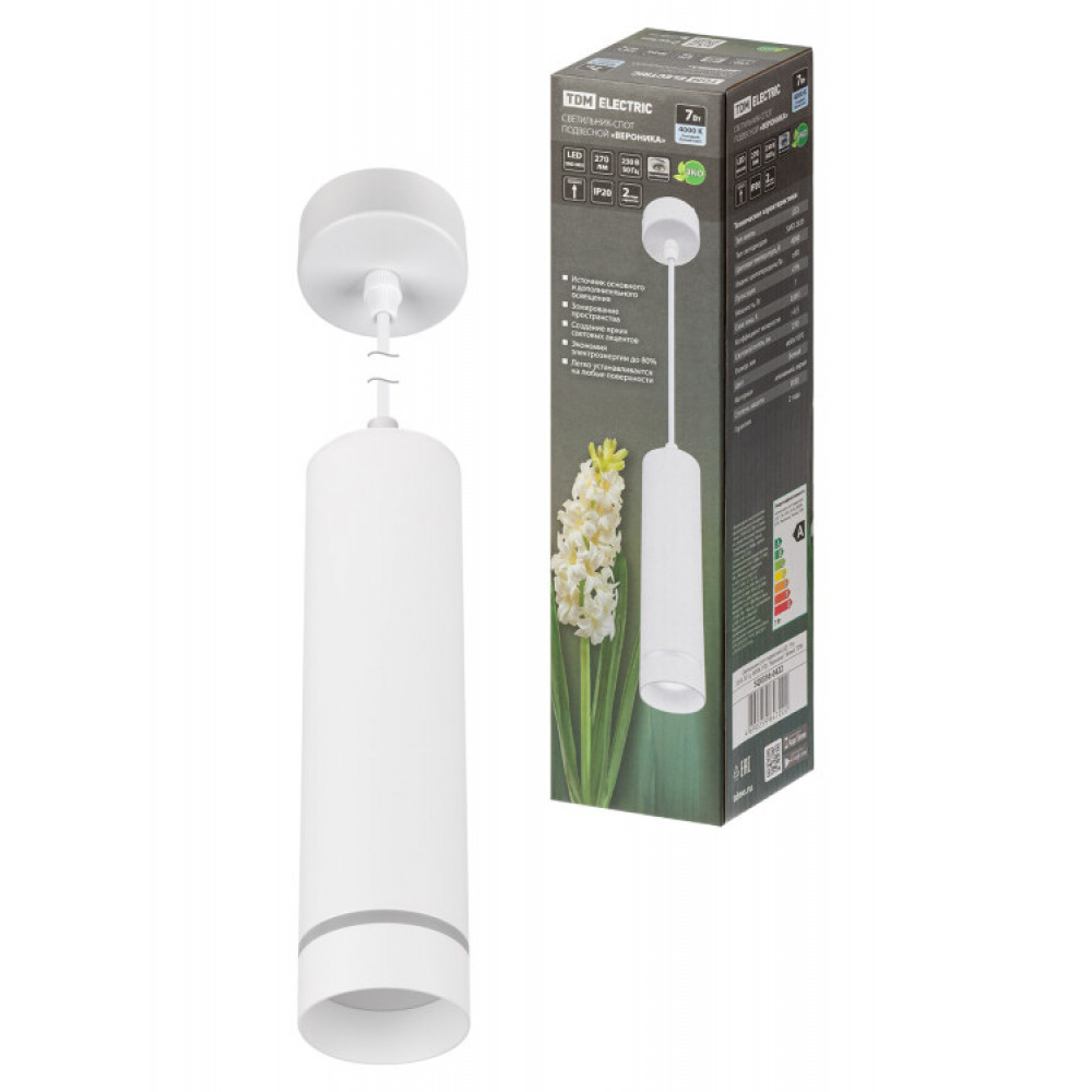 Описание Светильник-спот подвесной LED, 7 Вт, 230 В, 50 Гц, 4000К, IP20, "Вероника", белый, SQ0356-0422