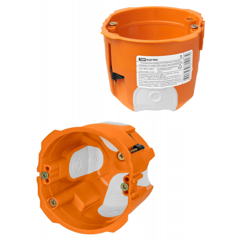 Описание Установочная коробка СП D73х65 мм, 2-х компон., саморезы, пл. лапки, IP30, оранж., инд. штрихкод SQ1403-2001