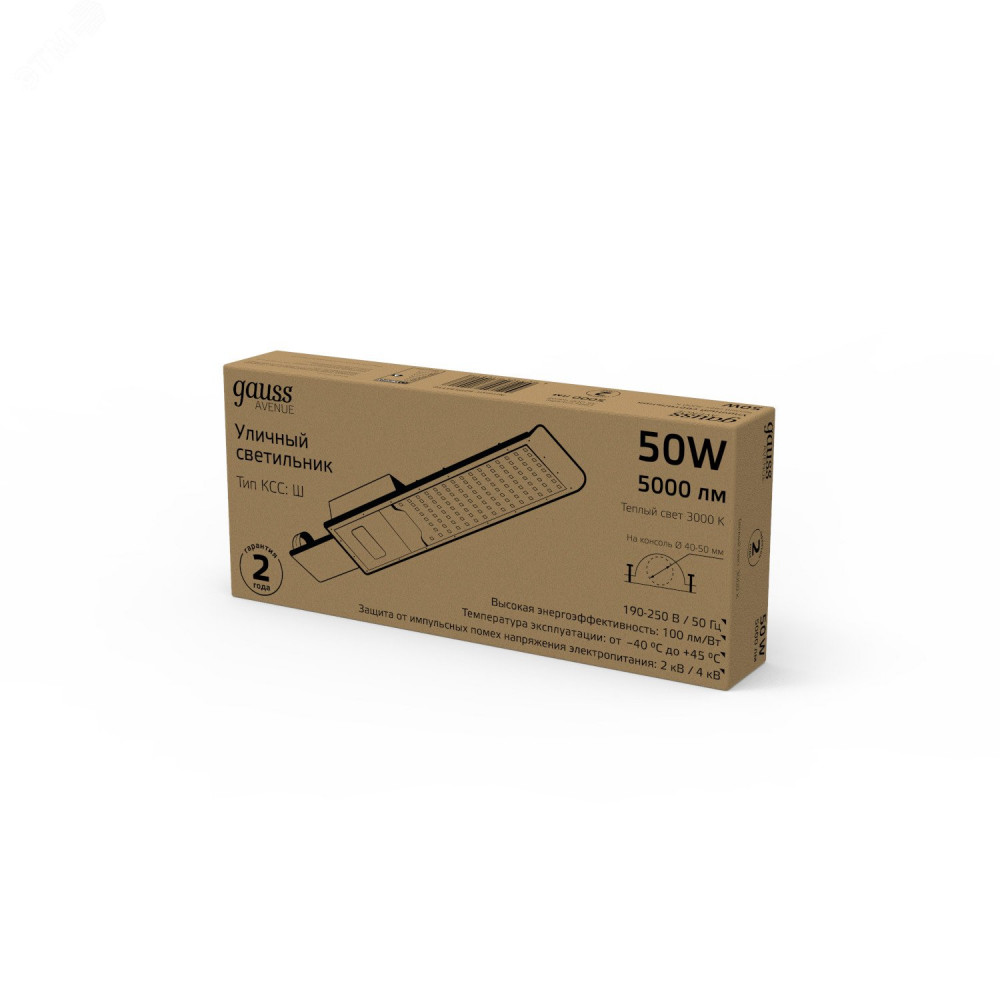 Описание Светильник уличный Avenue 50W 5000lm 3000K 190-250V IP65 355*155*57мм черный КСС "Ш" LED 1/10 629534150