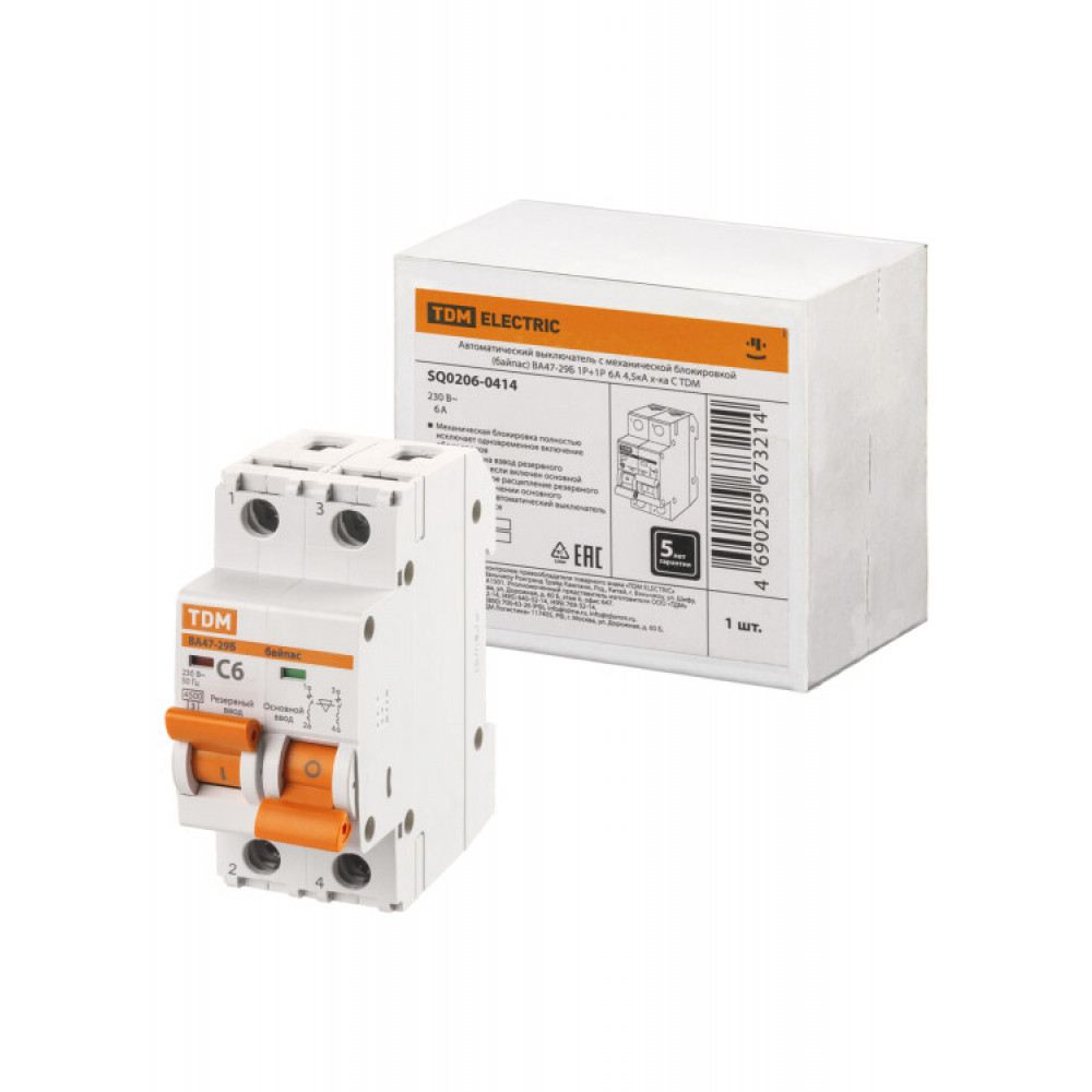 Доставка Автоматический выключатель с мех. блок. (байпас) ВА47-29Б 1Р+1Р 6А 4,5кА х-ка C SQ0206-0414