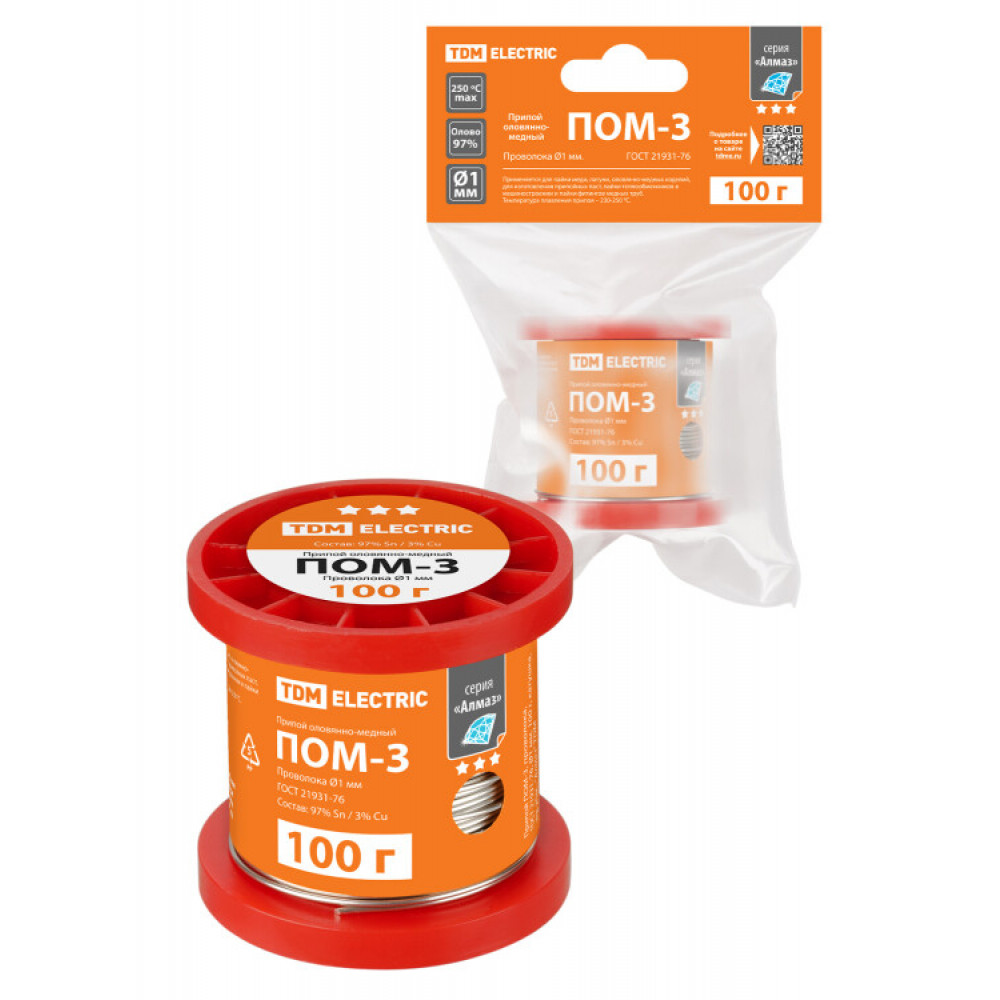 Описание Припой ПОМ-3, проволока, ГОСТ 21931-76, 1 мм, 100 г, катушка, инд. упак., "Алмаз" SQ1025-1814