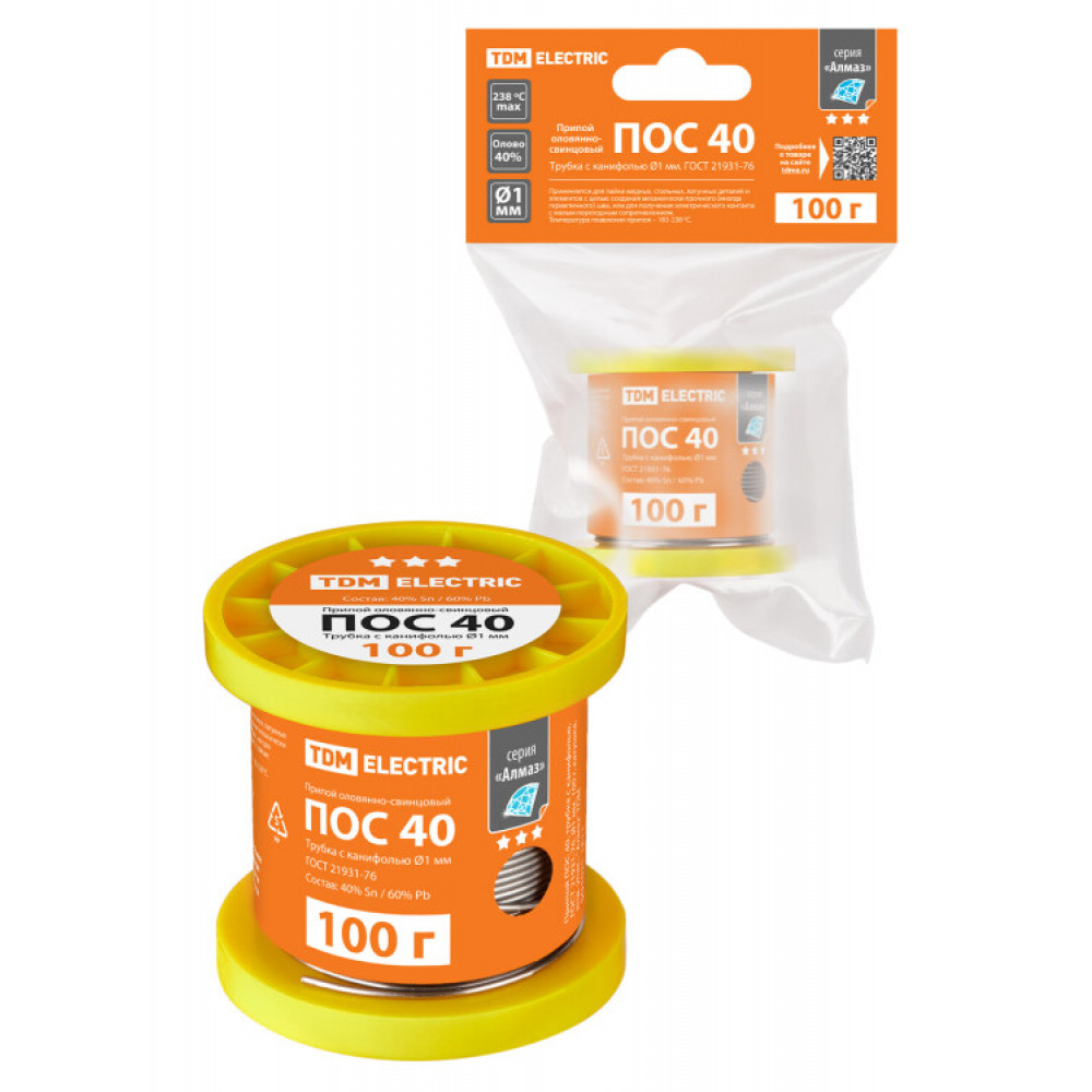 Описание Припой ПОС 40, трубка с канифолью, ГОСТ 21931-76, 1 мм, 100 г, катушка, инд. упак., "Алмаз" SQ1025-1811