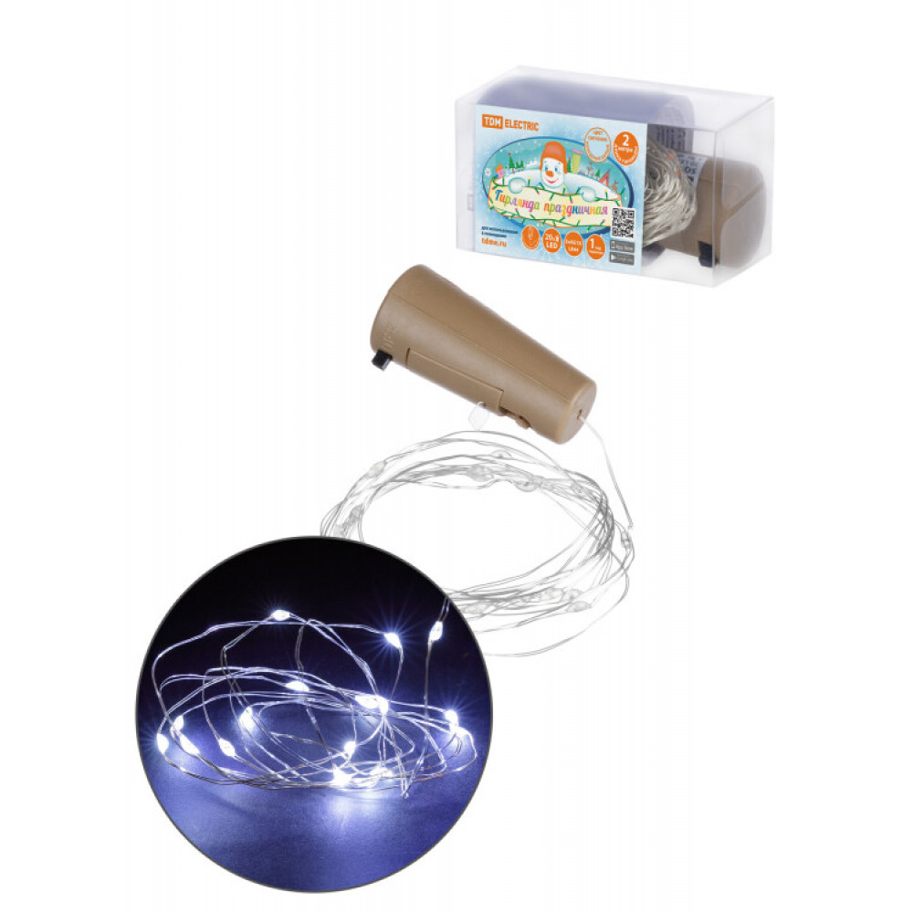 Гирлянда-пробка для бутылки "Роса20" 20LED, 2м, 6000К, 3хAG13/LR44, SQ0361-0103, Светильник декоративный