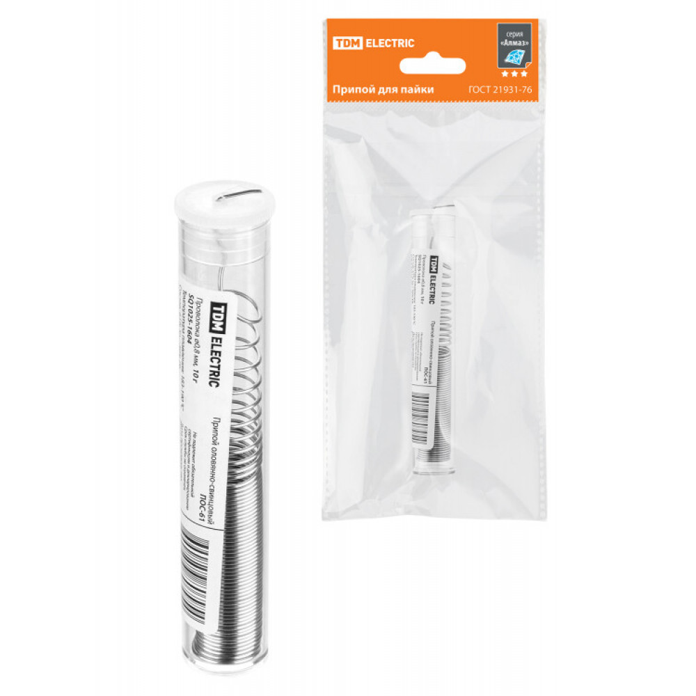 Описание Припой ПОС 61, проволока, ГОСТ 21931-76, 0,8 мм, 10 г, колба, серия "Алмаз" SQ1025-1604