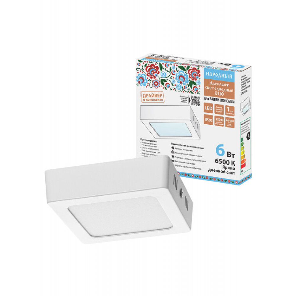 Описание Светильник светодиодный накладной "Даунлайт НАРОДНЫЙ" квадрат СПО (белый) алюминий 6Вт 6500К SQ0329-4202