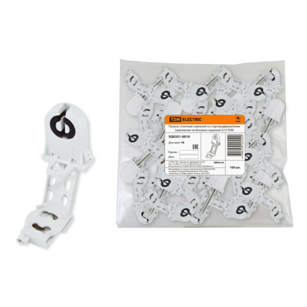 Патрон стоечный сквозной со стартеродержателем (крепление на боковые защелки) G13 SQ0351-0010, Патрон, ламподержатель, стартер, переходник