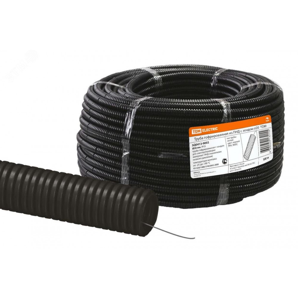 Труба гофрированная ПНД d 20 с зондом (100 м) легкая черная SQ0413-0002, Труба и короб для прокладки кабеля