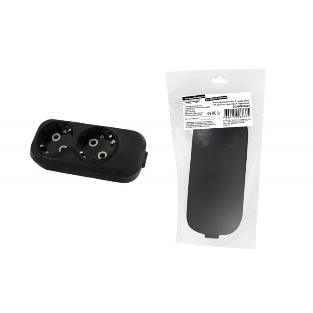 Колодка розеточная 2 гнезда 2П+З 16А 250В черная серии " Народная" SQ1806-0423, Удлинитель, сетевой фильтр