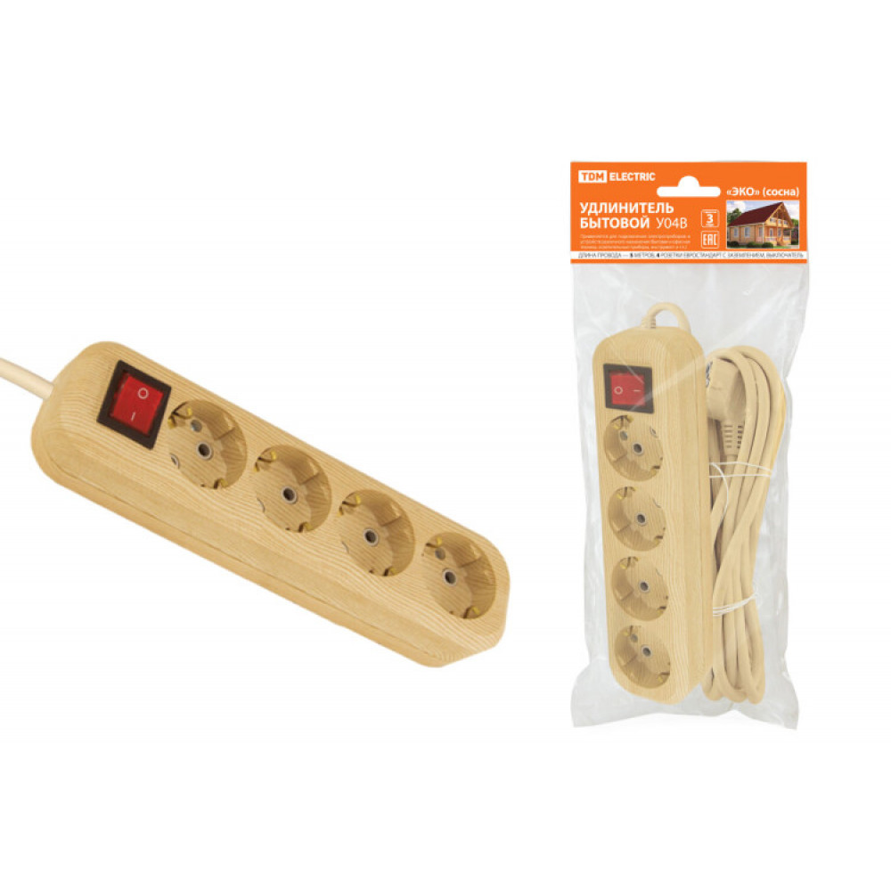 Описание Удлинитель бытовой У04В выключатель, 4 гнезда, 5метров,2П+3, ПВС 3х1мм2 "Эко" (сосна) 16А/250В SQ1303-2112
