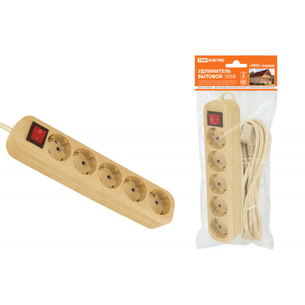 Описание Удлинитель бытовой У05В выключатель, 5 гнезд, 5метров,2П+3, ПВС 3х1мм2 "Эко" (сосна) 16А/250В SQ1303-2122