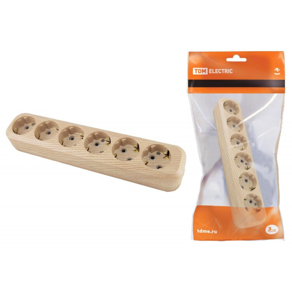 Колодка розеточная 6 гнезд 2П+3 16А 250В "Эко" (сосна) SQ1806-0057, Удлинитель, сетевой фильтр