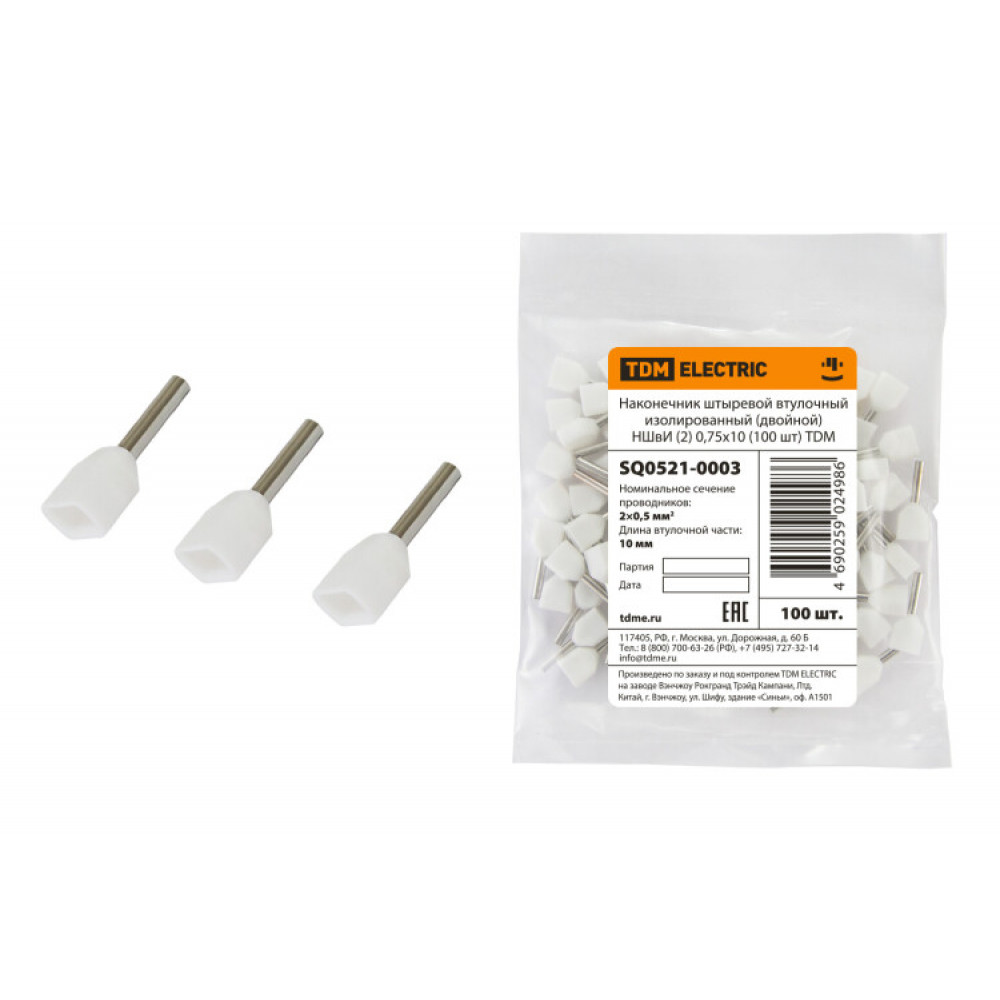 Наконечник штыревой втулочный изолированный (двойной) НШвИ (2) 0,75х10 (100 шт) SQ0521-0003, Наконечник, гильза
