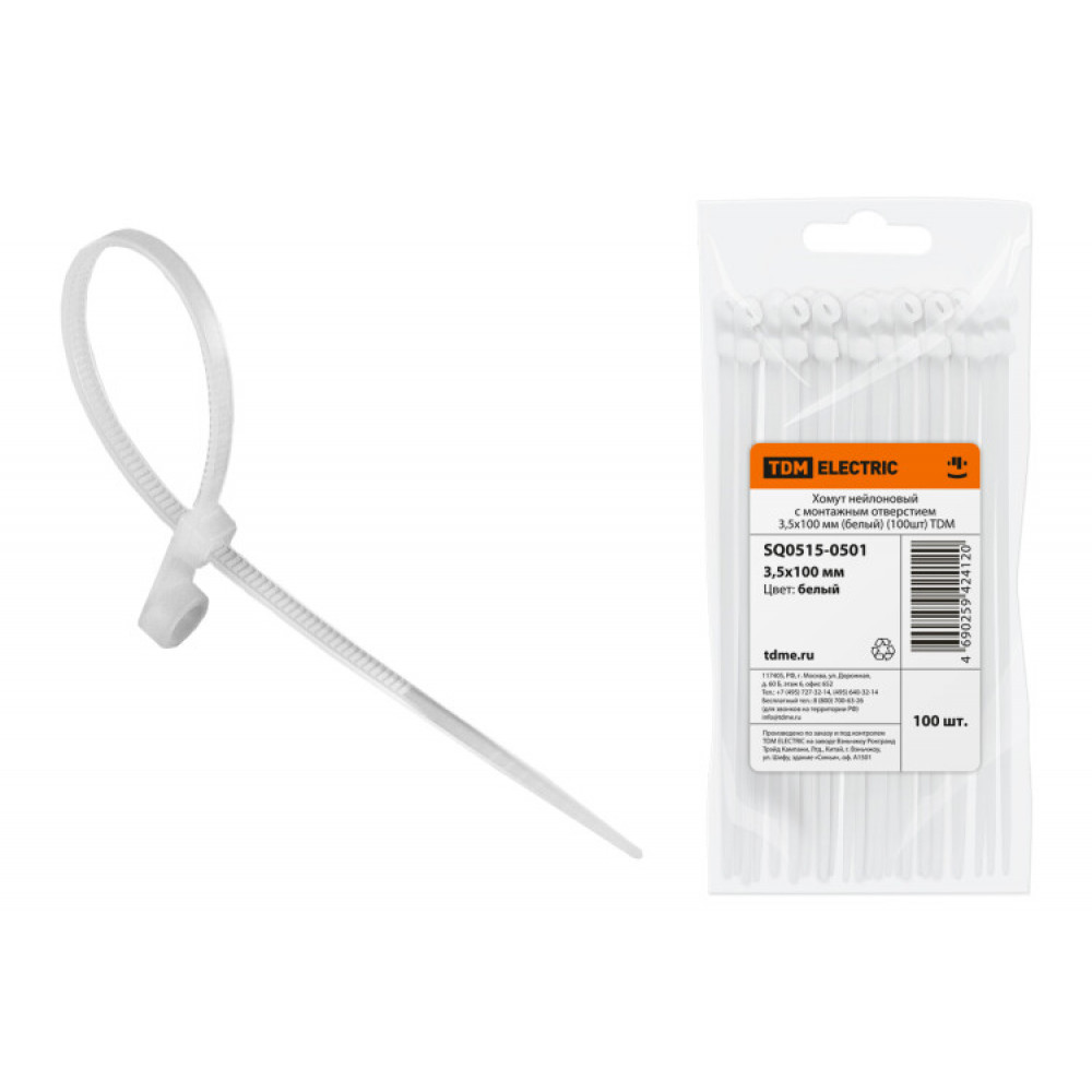 Описание Хомут нейлоновый с монтажным отверстием 3,5х100 мм (белый) (100шт) SQ0515-0501