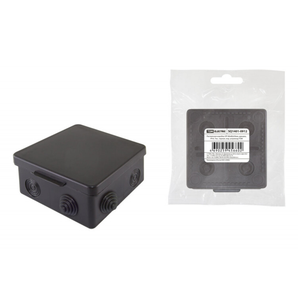 Описание Распаячная коробка ОП 80х80х50мм, крышка, IP54, 7вх., черная, инд. штрихкод SQ1401-0912