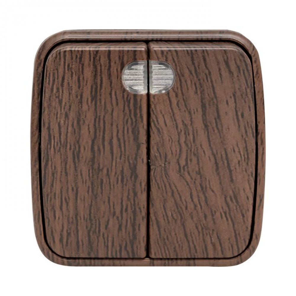 Выключатель 2-клавишный ОП Минск 10А с индикатором тёмное дерево EGV10-123-40, Выключатель и переключатель открытого монтажа