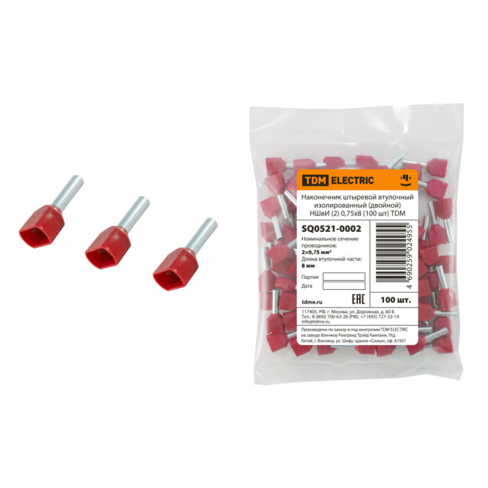 Наконечник штыревой втулочный изолированный (двойной) НШвИ (2) 0,75х8 (100 шт) SQ0521-0002, Наконечник, гильза