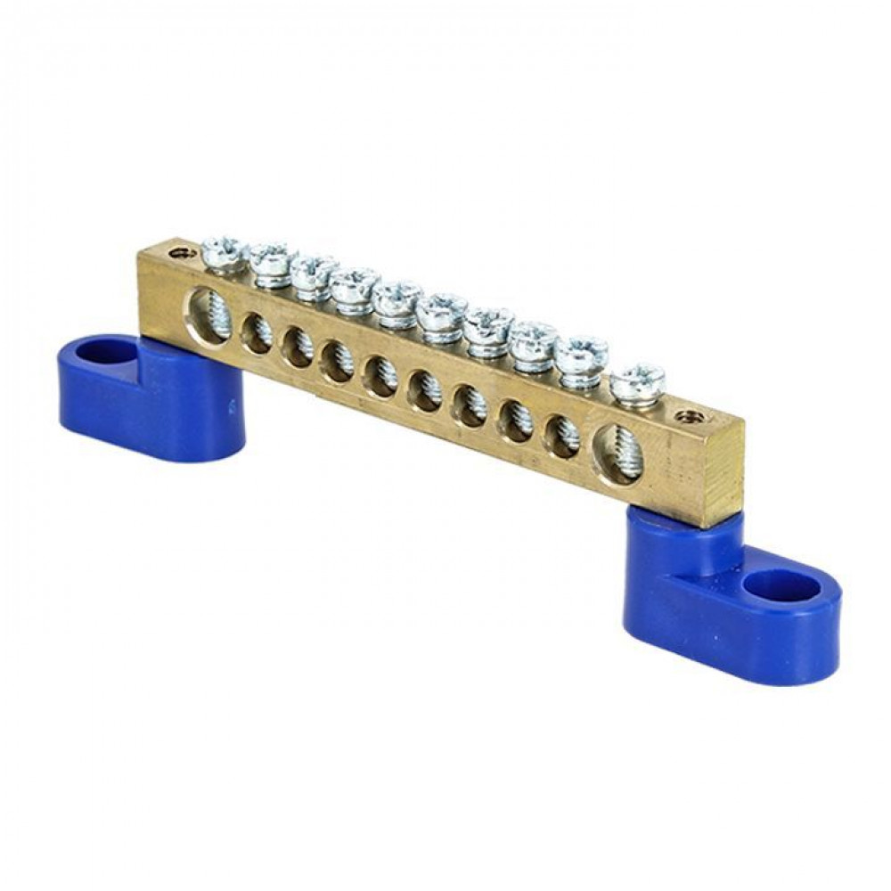 Шина "0" N (8х12мм) 10 отверстий латунь 2 синих угловых изолятора PROxima sn0-125-10-2, Блок клеммный и нулевая шина