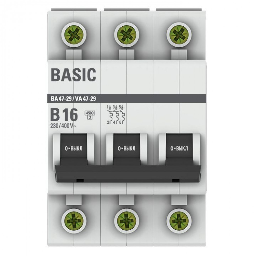 Автоматический выключатель 3P 16А (B) 4,5кА ВА 47-29 Basic mcb4729-3-16-B, Выключатель автоматический модульный